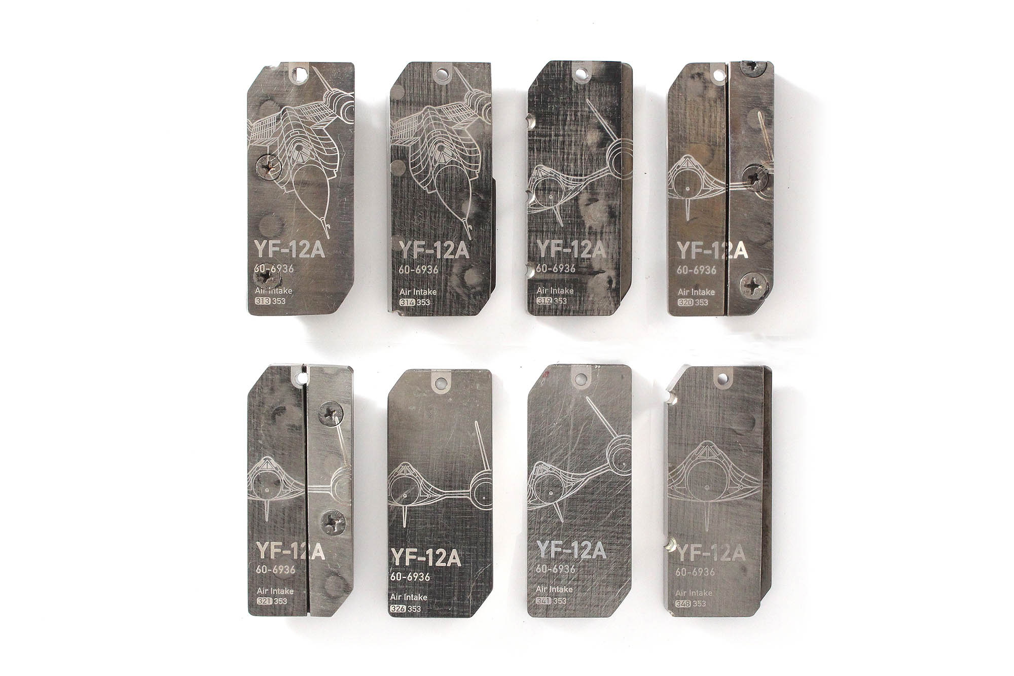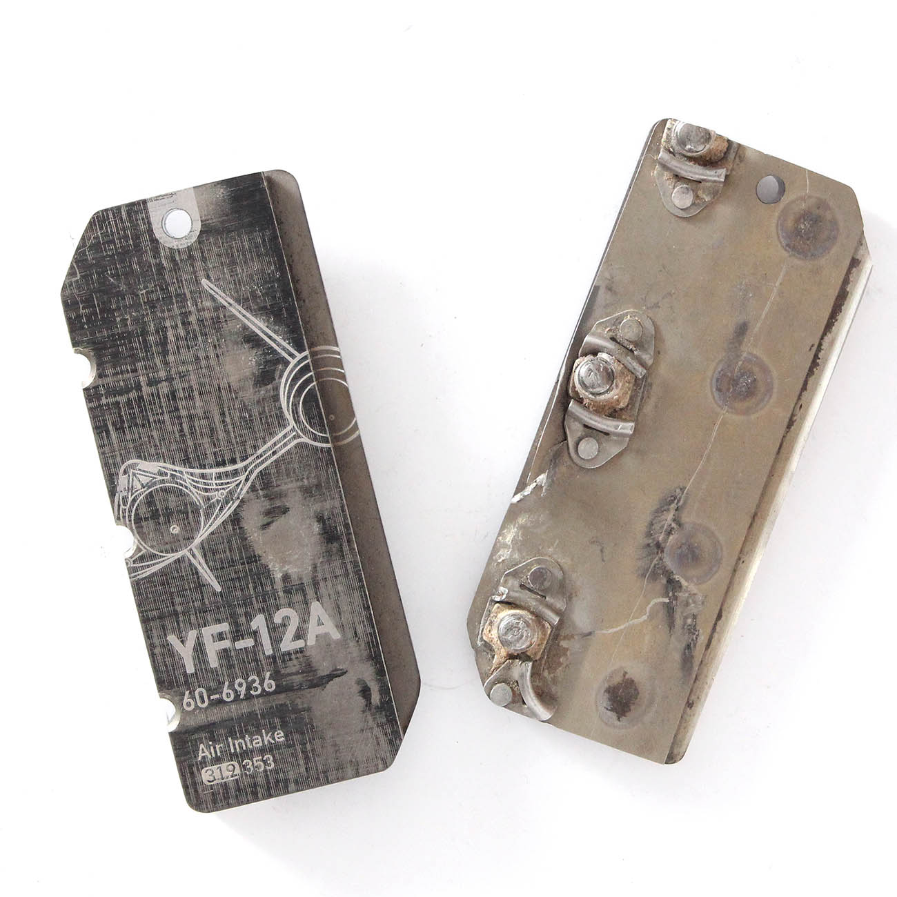 Air intake tags were cut from the ring section that surrounds the air intake of the YF-12A, s/n 60-6936. All tags are solid titanium. Tags 326 and 341 were cut from the leading edge of the ring, while the others come from the rear section.