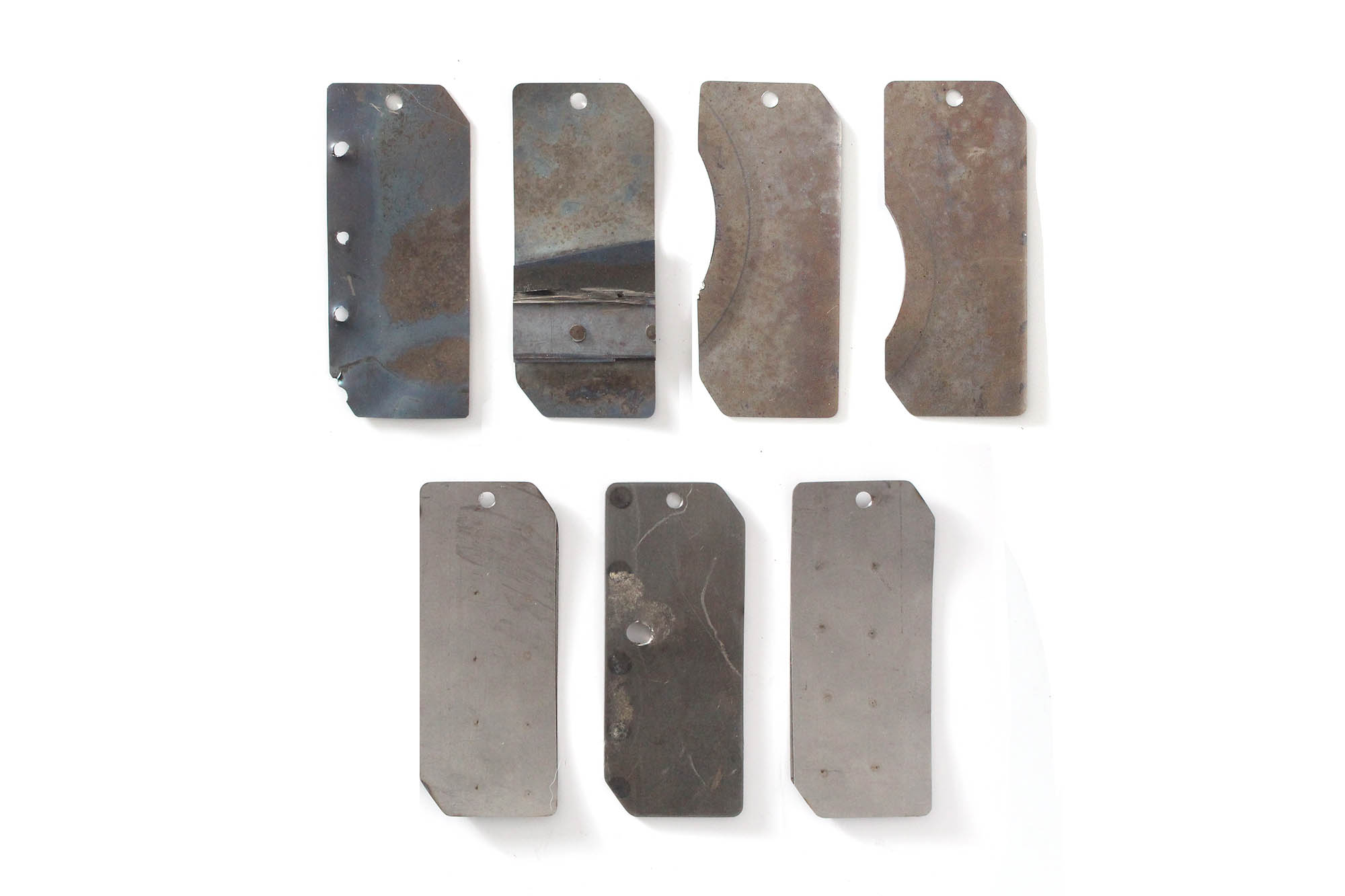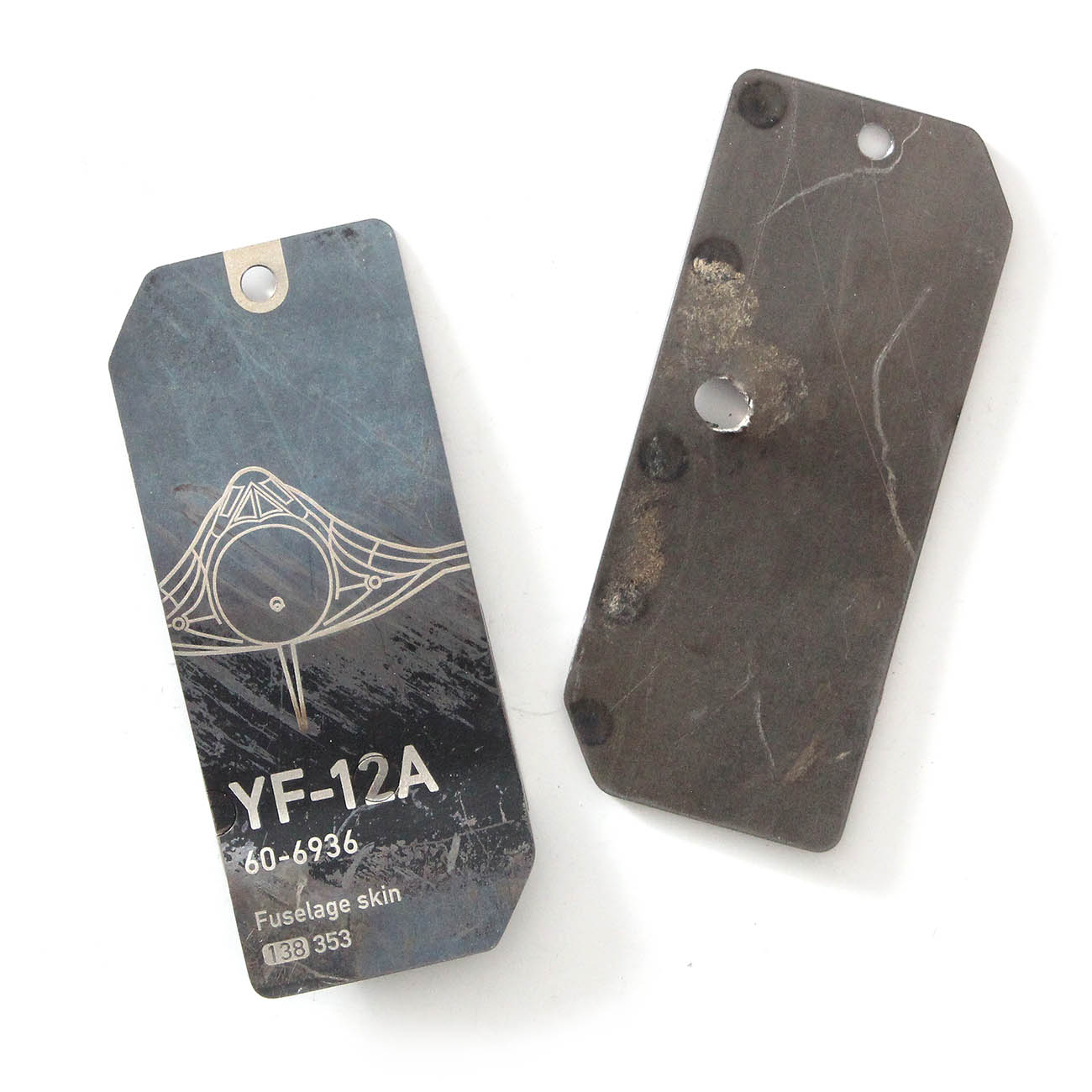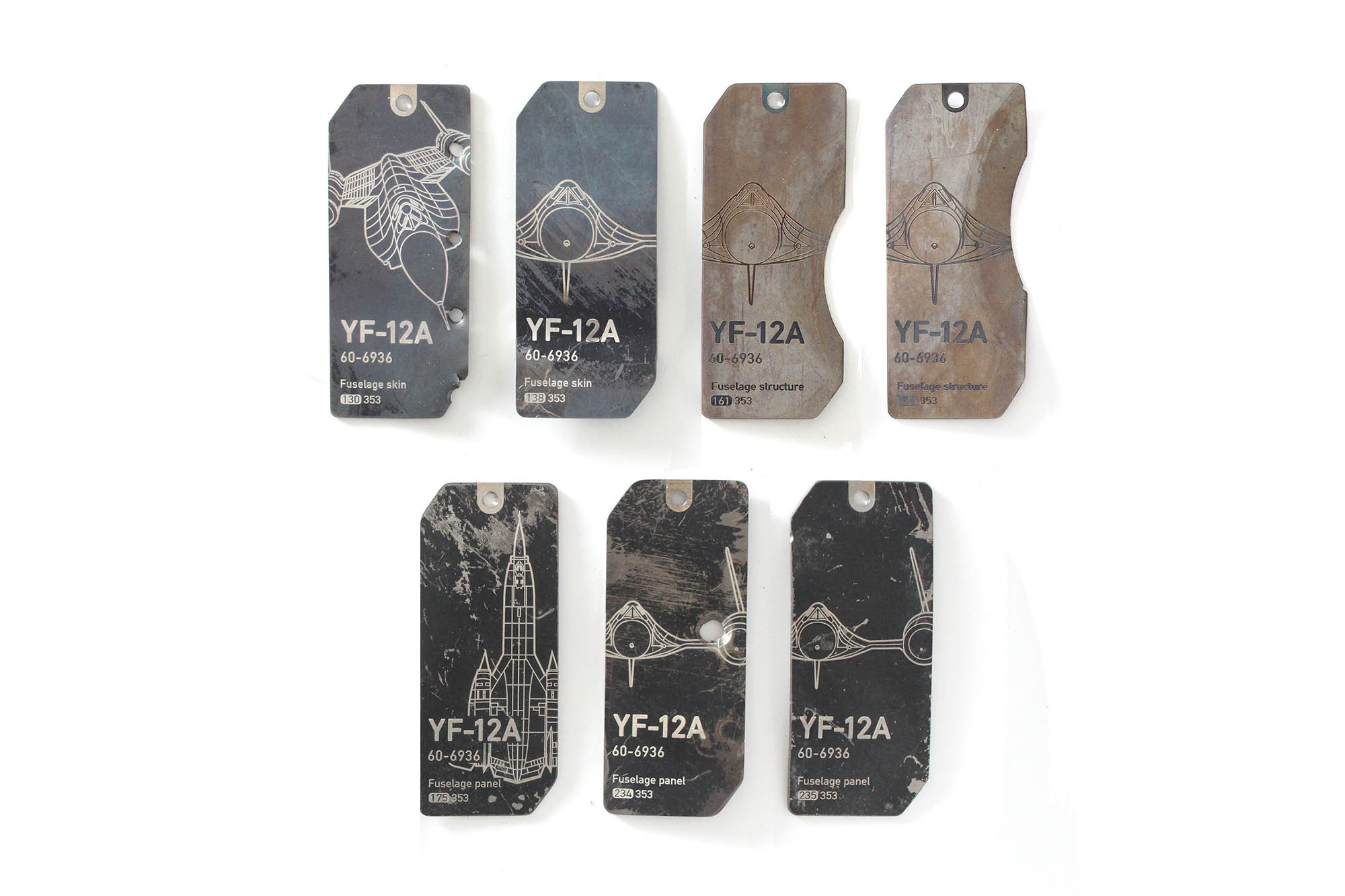 The tags in this variant were cut from various fuselage skin sections or access panels removed from the YF-12A, s/n 60-6936. Tag numbers 130 and 138 are bare and were cut from a skin section, while tags 146 and 161 were cut from the structural section from the airframe. Tags 175, 234, and 235 were made from different fuselage panels and feature a second layer of titanium welded on the back of the front face.