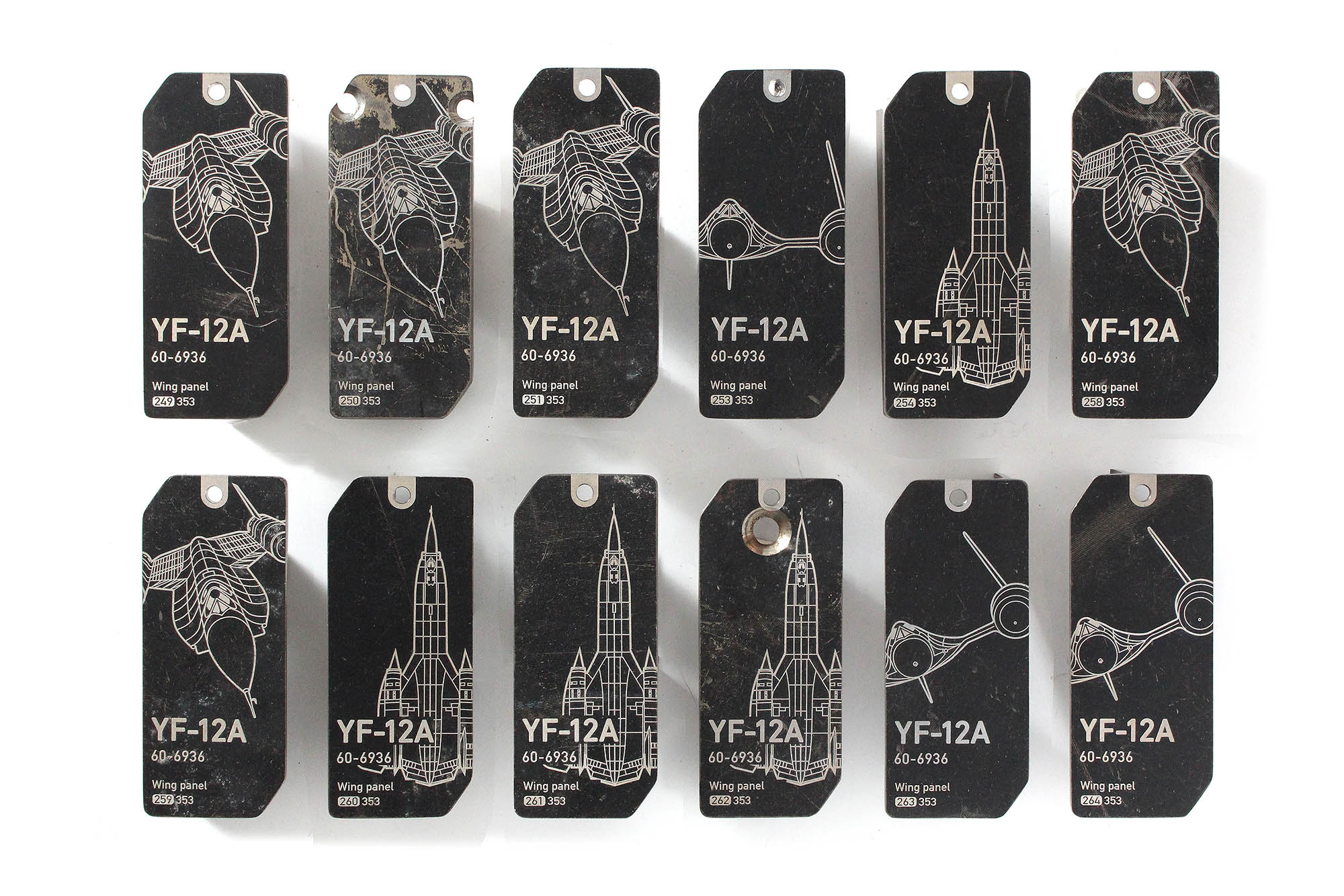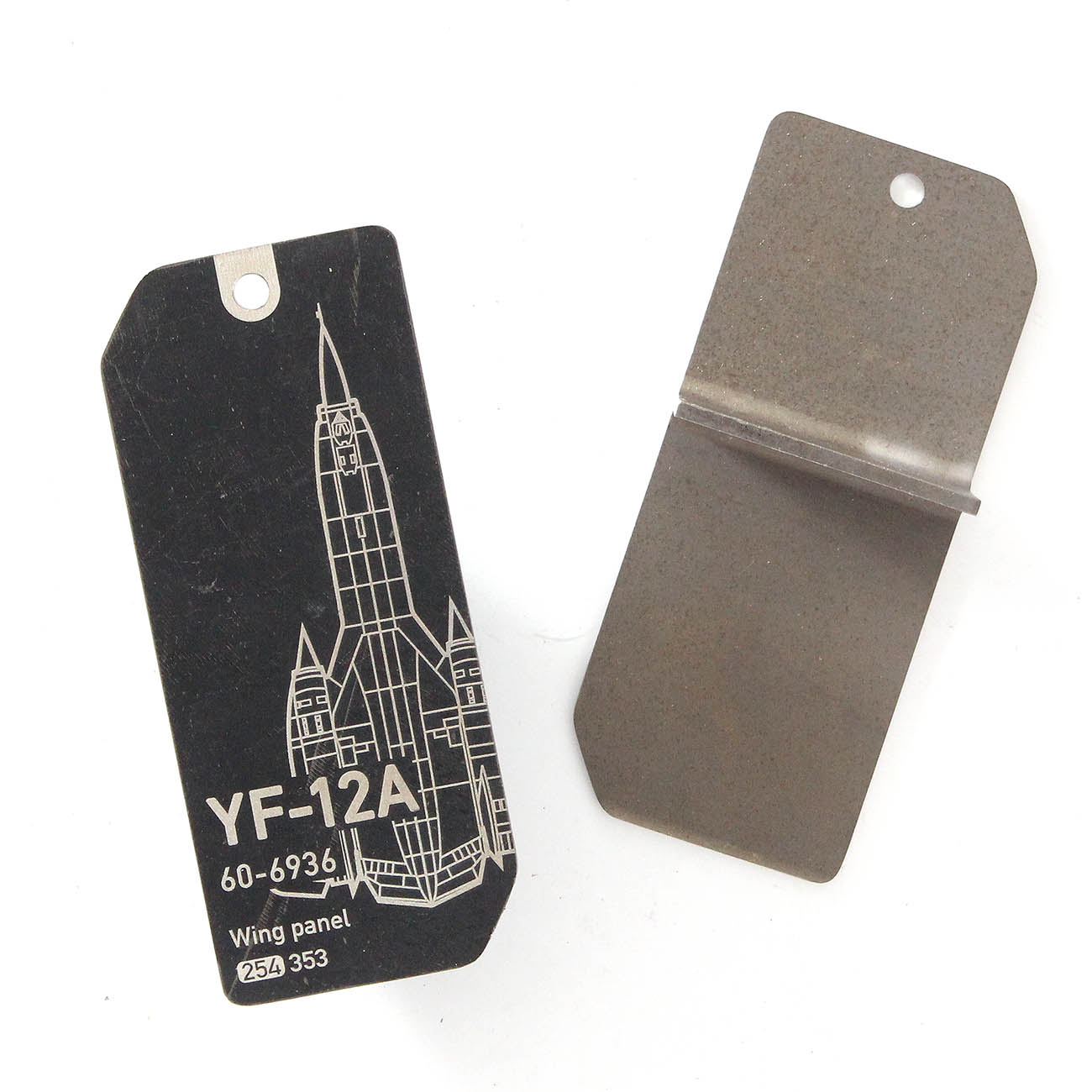 Solid wing panel with structured tags were cut from an access panel located on the wing of the YF-12A, s/n 60-6936. This wing panel was not made from a titanium “sheet”, but instead it was machined from a solid block of titanium and milled down to the required thickness! Because of this process, the surface of the tag shows thousands of circular lines paralel to each other, which are the milling marks left by the cutter.