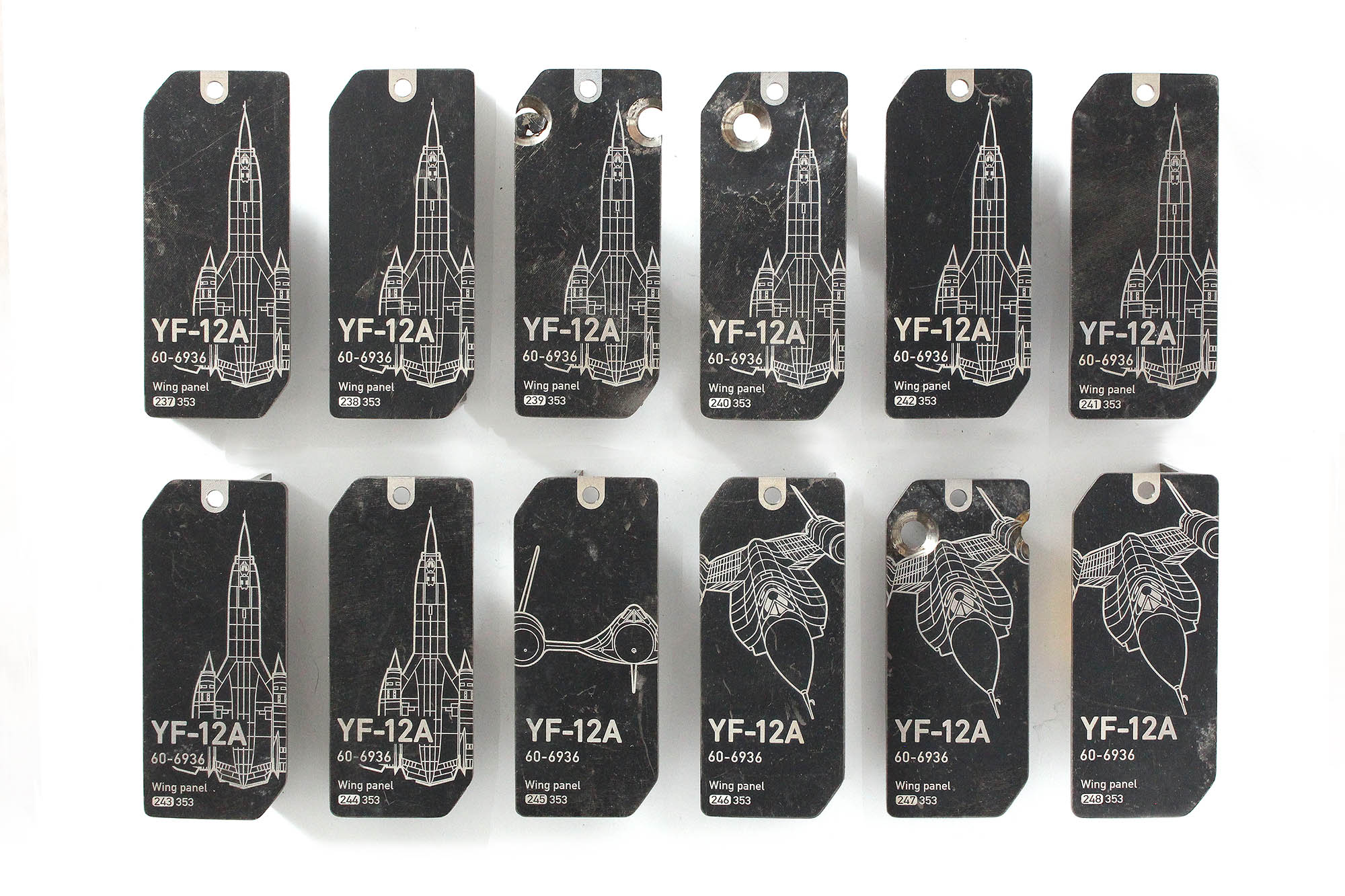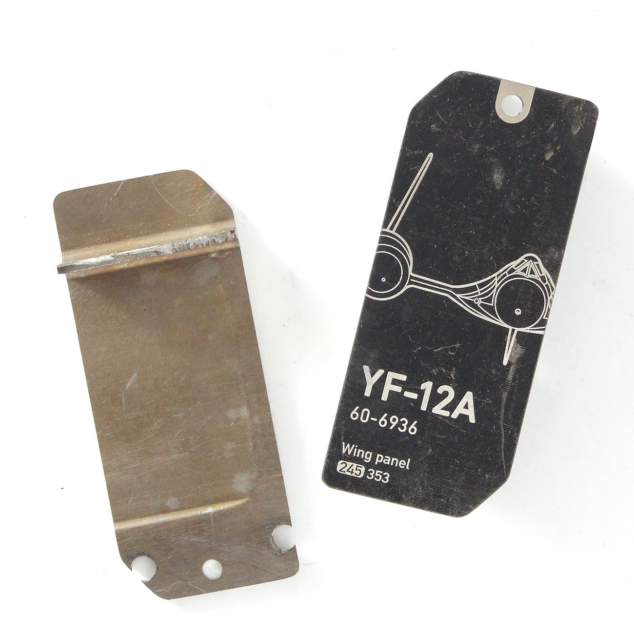 Solid wing panel with structured tags were cut from an access panel located on the wing of the YF-12A, s/n 60-6936. This wing panel was not made from a titanium “sheet”, but instead it was machined from a solid block of titanium and milled down to the required thickness! Because of this process, the surface of the tag shows thousands of circular lines paralel to each other, which are the milling marks left by the cutter.