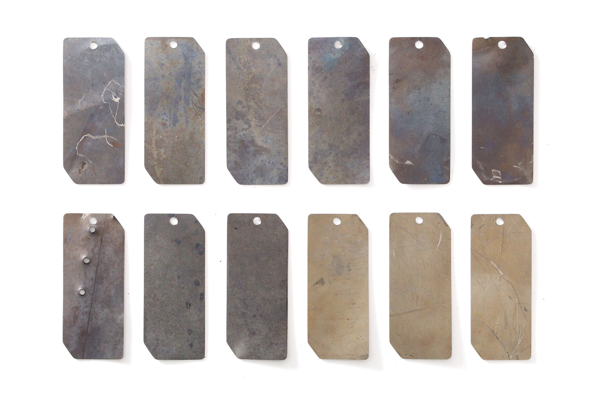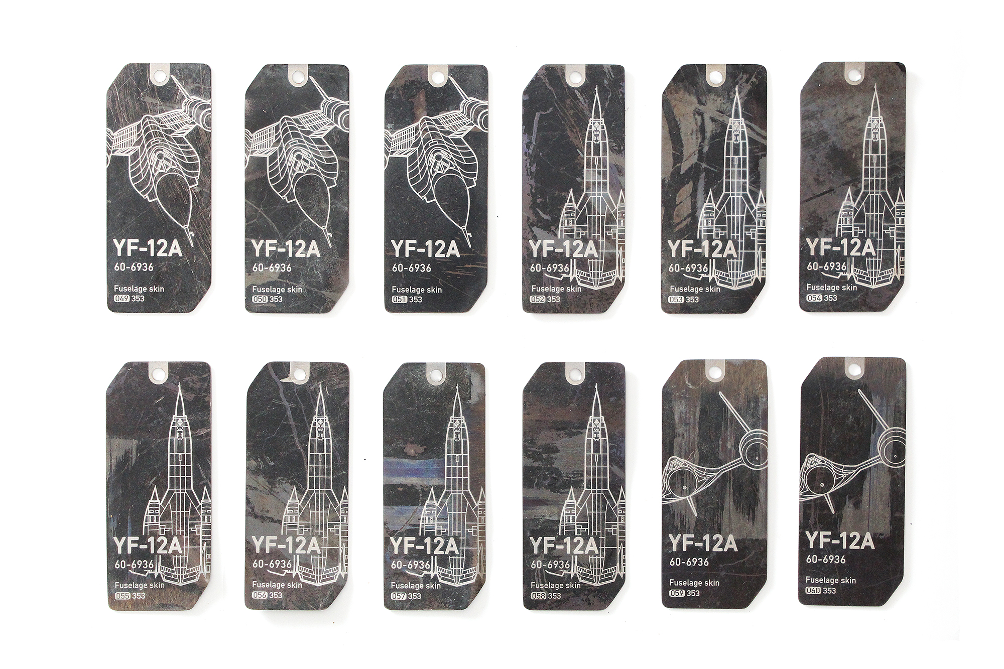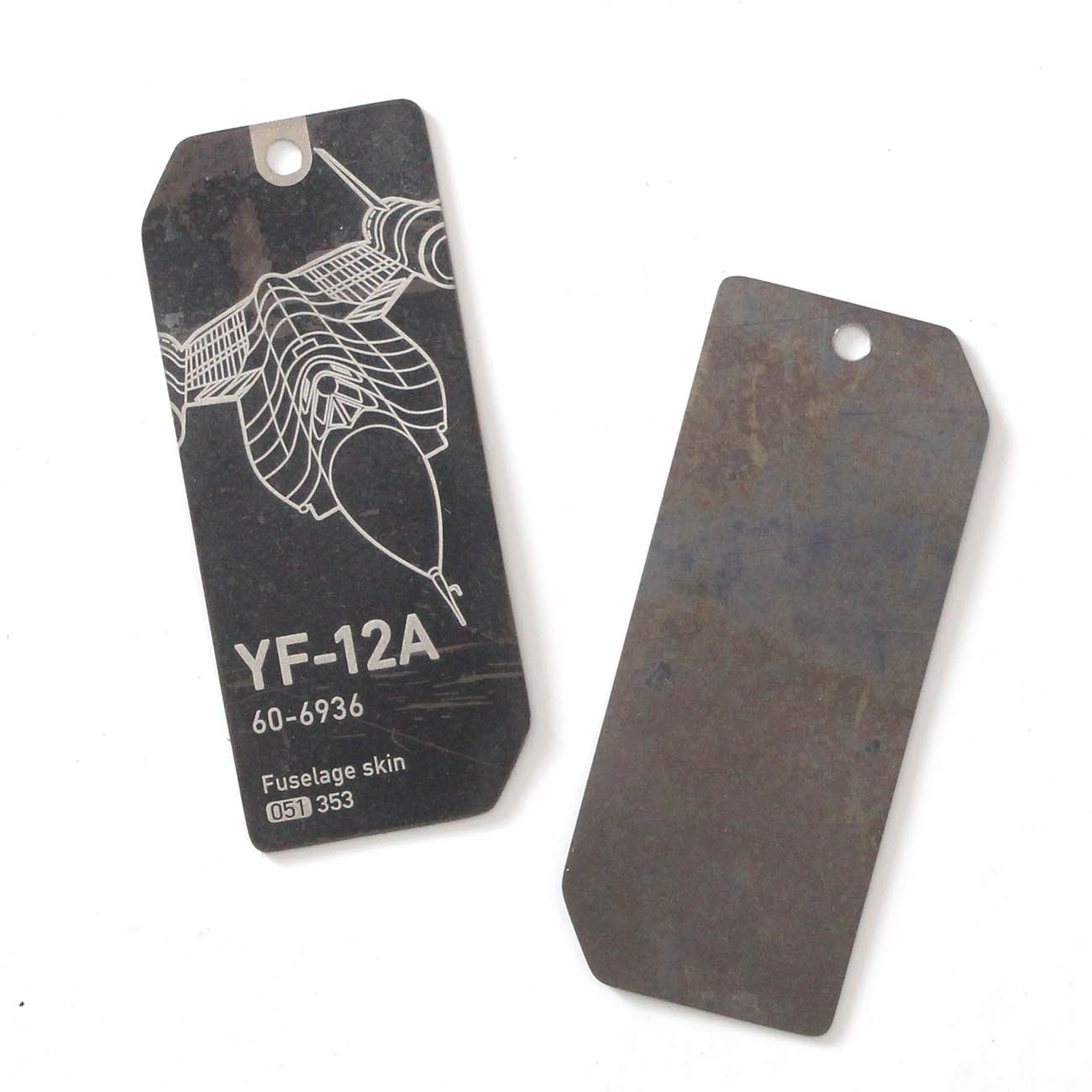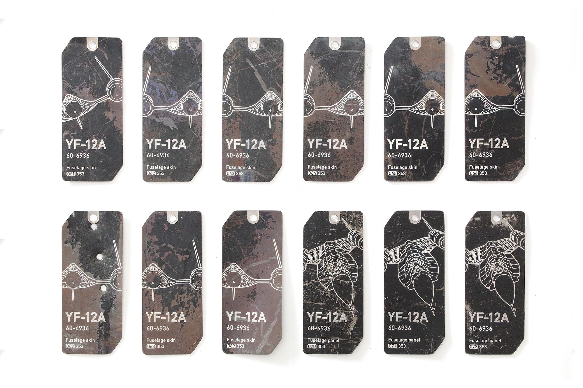 Thin titanium fuselage skin tags were cut from an outer skin or panel section of the YF-12A, s/n 60-6936.