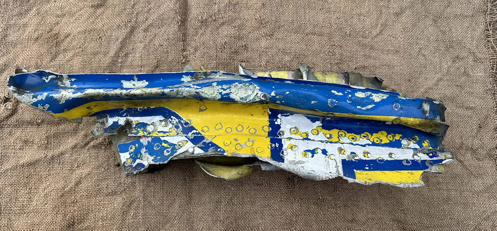 Crushed remains of the skin section located beneath the cockpit, where part of the Ukrainian Falcons name in Ukrainian, ‘Українські Соколи,’ is still visible. This particular section was among the parts I received and later turned into tags.
